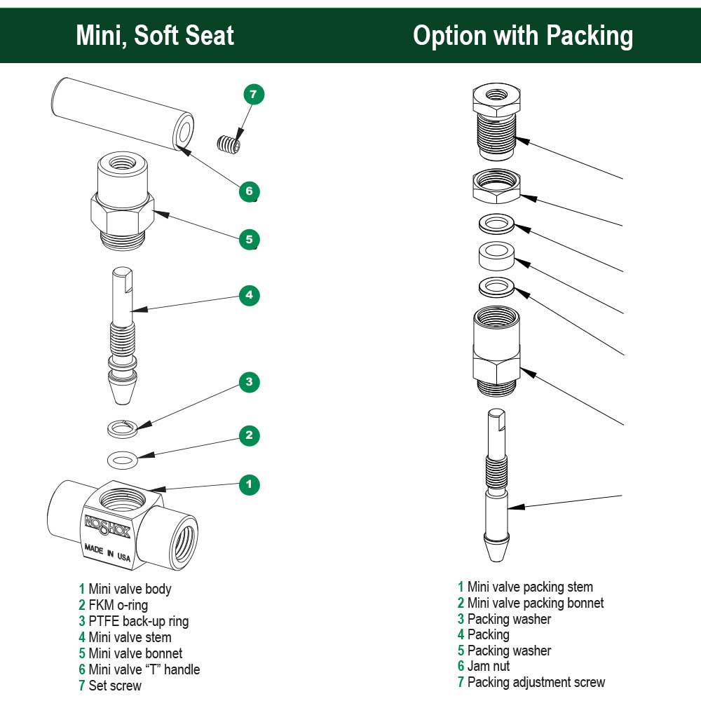 ▲| Note | All NOSHOK valve products conform to the MSS SP-99 instrument valves standards, and valves supplied with packing also conform to MSS SP-132 compression packing systems for instrument valves standard. Please note that the standard o-ring in all the NOSHOK mini valves is FKM and the standard handles are brass round knurled handles (HL3), steel 1-3/8" mini "T" handles (HL7), and 316SS 1-3/8" mini "T" handles (HL7) The handle material will always match the material of the valve, unless otherwise specified. For example, the round knurled handles (HL3) on a 152-FFB will be brass. When only the standard configuration is needed, no additional designations are necessary. Please consult the factory for special application requests. O-Ring - Other o-ring materials available on request. |