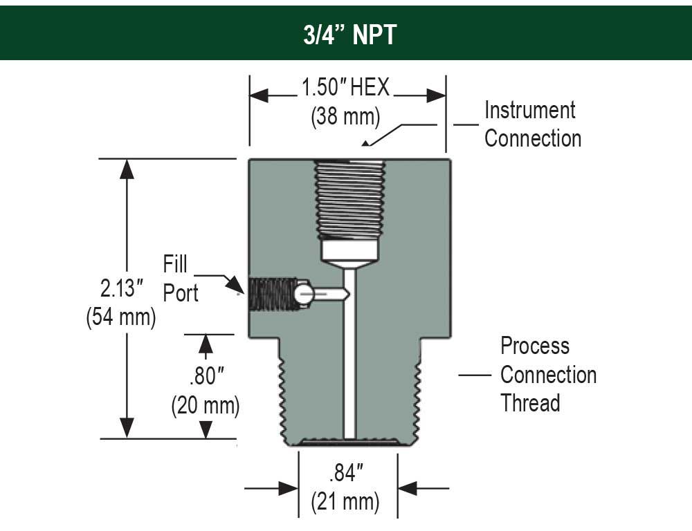 - Available instrument connection sizes are 1/4” and 1/2" with a process connection size of 1/2" NPT male to 2" NPT male