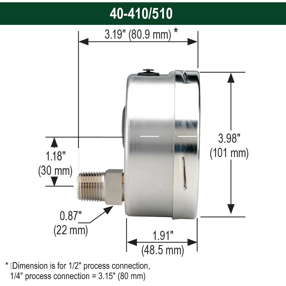 Ammonia and refrigeration gauges with dials reading in both pressure and temperature are available in 400/500 Series 2-1/2" and 4" sizes